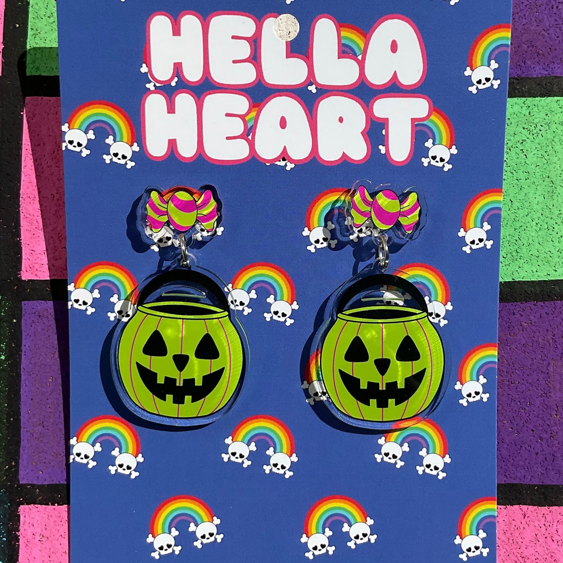Made with 3mm printed acrylic, these earrings are a nostalgic nod to the classic jack-o-lantern candy bucket. Lightweight for all day wear.